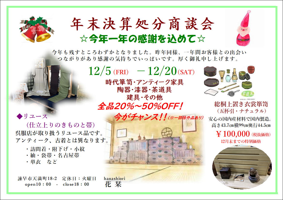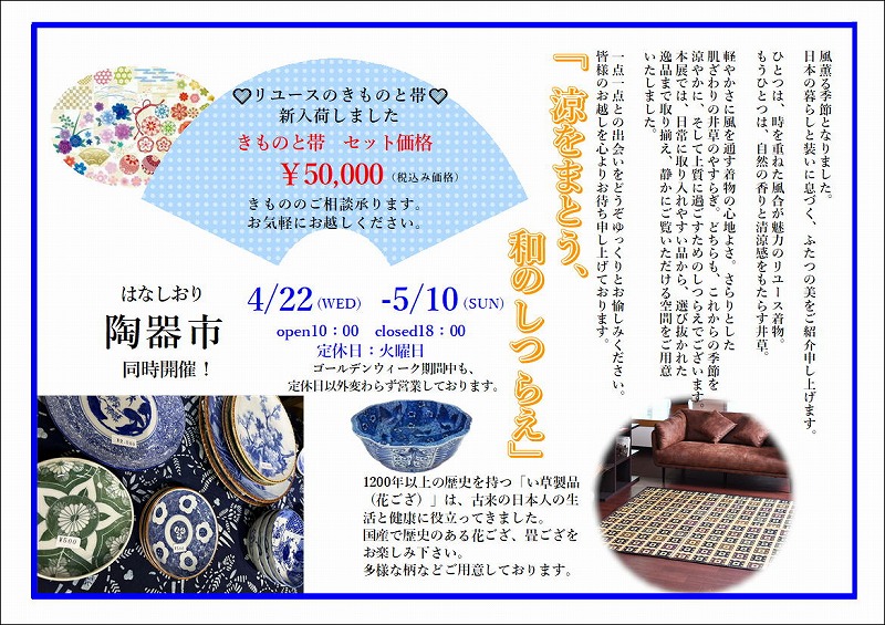 花栞は古くからずっと受け継がれてきた大切な日本の文化と暮らしを和装小物や骨董品、着物などを通して皆様にお伝えする道しるべとして諫早という地に存在しています。
